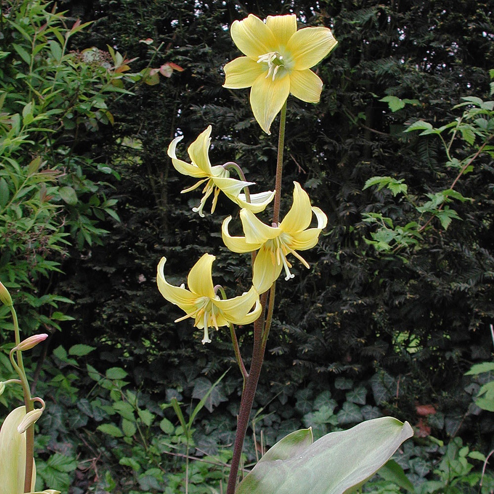 Strap-like leaves of bright green with some darker mottling. The flowers are pendant with reflexed petals and of a glowing, light yellow, which shows up well in the semi-shaded situation that the plant prefers.